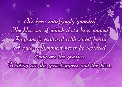 Indeed, after your difficult effort to survive in prairie filled with wild grass, then it is time for a selected man to take you by the hand. With your pure enchanting fragrant, your elegance and honour that you’ve preserved without blemish, have put you in the position of a worthy woman to be chosen. But one thing you have to remember that after the blossom, the battle has not yet ceased. Marriage is a turning point where your battle field changes. You are no longer a girl. Your responsibility, attention and struggle have increased; you should start thinking about your own family, your children, and your husband. My advice for you is to keep your fragrance which you have guarded all the way.